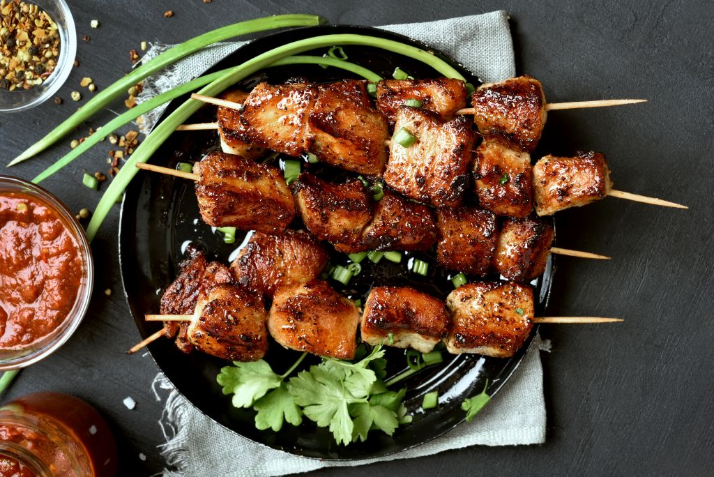 5. Περνάτε στα καλαμάκια κρέας και λεμόνι εναλλάξ ανά δύο κομμάτια κρέατος. Τα αλείφετε με τη μαρινάδα, τα πασπαλίζετε με αλάτι και πιπέρι και τα ψήνετε στη σχάρα ή στο γκριλ μέχρι να ροδοκοκκινίσουν. Κατά διαστήματα τα ραντίζετε με τη μαρινάδα.