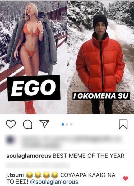 Χτες το βράδυ της Τετάρτης, η γνωστή τρολ περσόνα του Instagram, η Soula Glamorous σχολίασε με χιουμοριστικό τρόπο το νέο ειδύλλιο της showbiz, παίρνοντας, όπως θα δεις, ξεκάθαρα το μέρος της Ιωάννας Τούνη. Η ξανθιά σεξοβόμβα φυσικά και δεν θα μπορούσε να μην σχολιάσει το συγκεκριμένο ποστ, αφού την αφορούσε άμεσα.