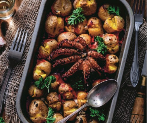 3. Καθαρίζετε το χταπόδι και το πλένετε πολύ καλά. Το κόβετε σε κομμάτια αν είναι μεγάλο, ή το βάζετε ολόκληρο αν είναι μικρό σε ένα ταψί. Μεταφέρετε και τις πατάτες.