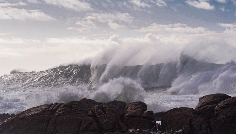 Μεγάλα κύματα χτυπούν το Blue Star Paros και επιβάτες που βρίσκονται μέσα παρακολουθούν την πορεία του πλοίου και πολλοί τραβούν βίντεο με τα κινητά τους τηλέφωνα. Η θάλασσα φτάνει στο πάνω κατάστρωμα και σκεπάζει τα παράθυρα του σαλονιού.