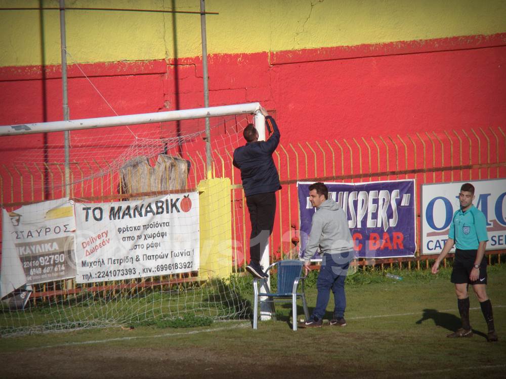 Μια μεταλλική καρέκλα επιστρατεύτηκε για να πατήσει πάνω ο φροντιστής του γηπέδου προκειμένου να ενώσει, έστω και προσωρινά, το οριζόντιο με το κάθετο δοκάρι για να παιχτούν τα τελευταία δέκα λεπτά της αναμέτρησης…