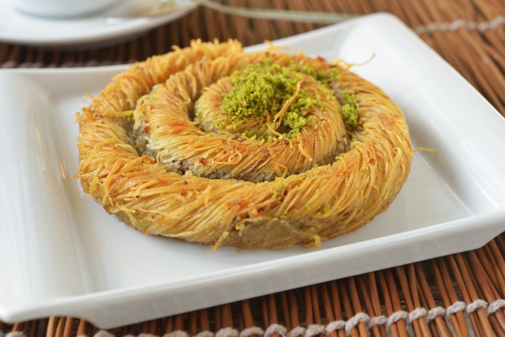 1.Ανοίξτε το κανταΐφι σε στενόμακρη θέση. Βάλτε στο κέντρο τα τριμμένα φιστίκια Αιγίνης, αφού τα ανακατέψετε με το ασπράδι αυγού.