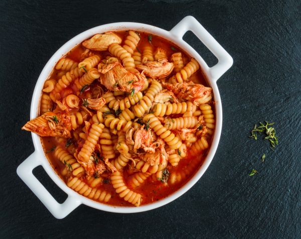 4.Ανακατέψτε τις βρασμένες βίδες με την σάλτσα και προσθέστε τα υπόλοιπα υλικά εκτός από την κρέμα γάλακτος. Ανακατέψτε τα όλα μαζί και αδειάστε τα στο πυρέξ.