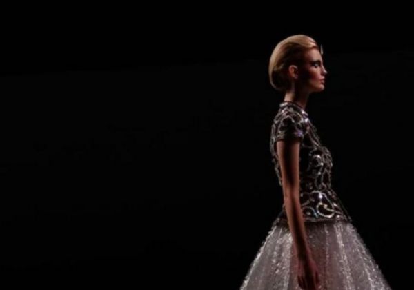Έτσι πάνω στην πασαρέλα, τα μανεκέν με κεντημένα πανωφόρια, με φορέματα σε ροζ τούλι ή καναρινί και βαθιά ντεκολτέ, περπατούν φορώντας στο πρόσωπο εντυπωσιακές μάσκες με στρας γύρω από τα χείλη και τα μάτια.
