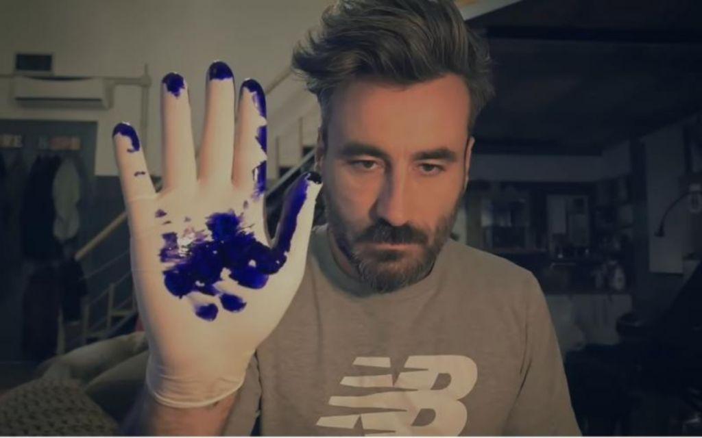 Ειδικότερα, χρησιμοποιεί σινική μελάνη ως παράδειγμα πάνω στα πλαστικά γάντια για να γίνει πιο κατανοητός πως μπορεί να μεταδοθεί ο ιός.