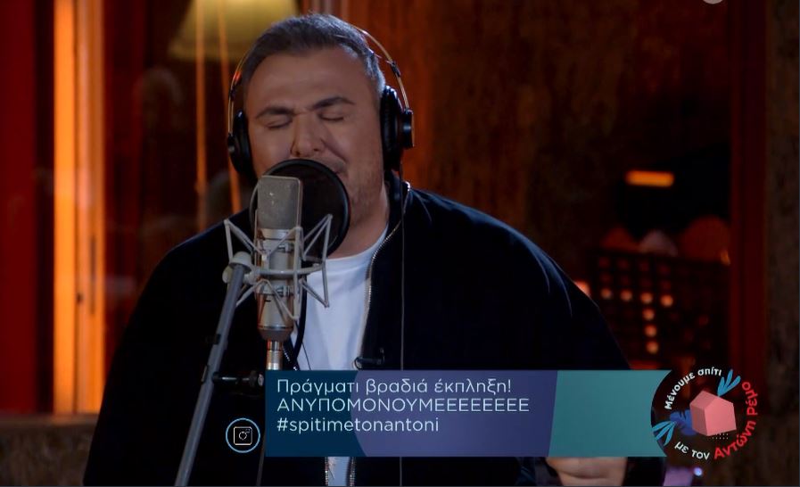 «spitimetonantoni και η καραντίνα αποκτά νόημα» έγραψε άλλος τηλεθεατής, όταν ο Αντώνης Ρέμος τραγουδούσε «Θα ’πρεπε να σουν εδώ».