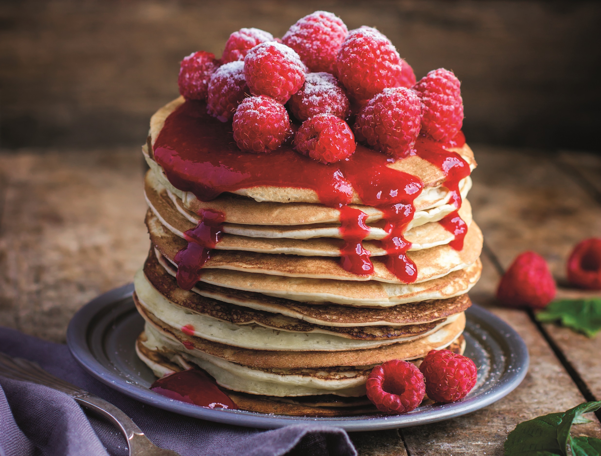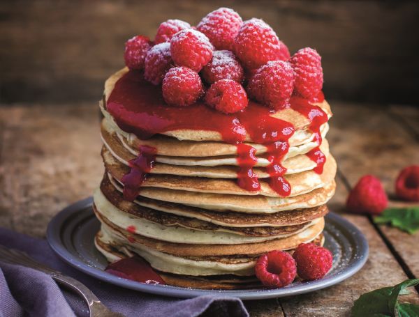 6. Οταν κάθε pancake είναι χρυσοκίτρινο και στις δύο πλευρές, το βάζετε σε ένα πιάτο. Οταν τελειώσετε με όλο το μείγμα, περιχύνετε τα pancakes με τη σάλτσα σμέουρων. Αν θέλετε, μπορείτε να γαρνίρετε με λίγη ζάχαρη άχνη. Σερβίρετε τα pancakes ζεστά και απολαύστε αμέσως.