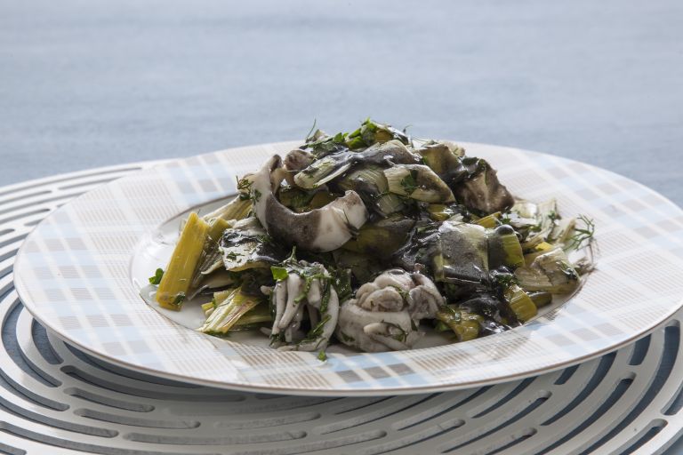 Βάζουμε κέντρο του πιάτου το πράσο, από πάνω τις σουπιές κομμένες σε μεσαία κομμάτια. Ρίχνουμε από πάνω τα φύλλα μυρωδικών και τα κομμάτια σέλερι. Σερβίρουμε με τη σάλτσα από μελάνι και ραντίζουμε με ελαιόλαδο.