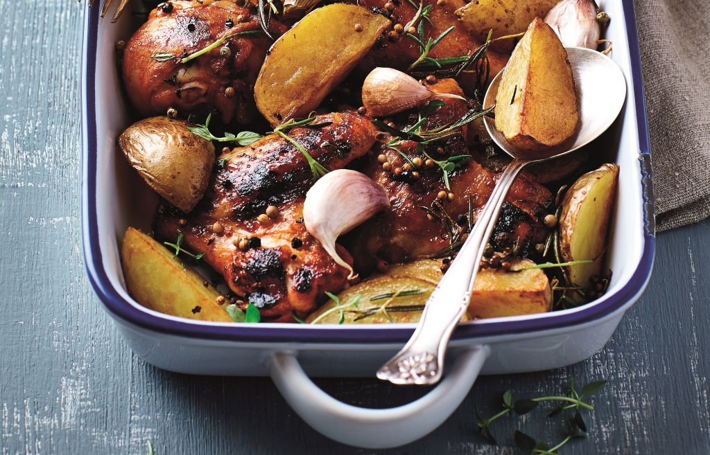 3. Περιχύνετε με το μείγμα το κοτόπουλο και τις πατάτες. Προσθέτετε το δεντρολίβανο και τις σκελίδες σκόρδου ολόκληρες και όχι καθαρισμένες.