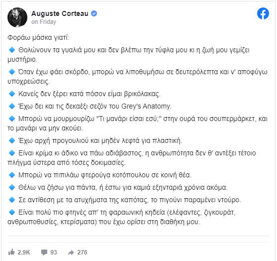 Σε μία από τις πιο πρόσφατες λοιπόν δημοσιεύσεις του και με φόντο τις εξελίξεις γύρω από τον κοροναϊό στη χώρα μας, ο Αύγουστος Κορτώ, κατέγραψε με χιούμορ τους δικούς του 11 λόγους για τη χρήση προστατευτικής μάσκας.