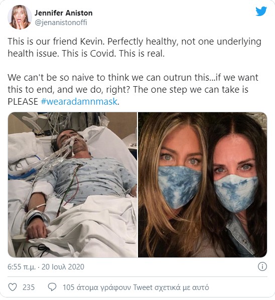 «Αυτός είναι ο φίλος μας ο Κέβιν. Απόλυτα υγιής χωρίς κανένα υποκείμενο νόσημα. Αυτός είναι ο κορονοϊός. Αυτό είναι αληθινό» έγραψε η Άνιστον συνοδεύοντας το μήνυμά της με τη συγκλονιστική φωτογραφία του φίλου της στο νοσοκομείο.