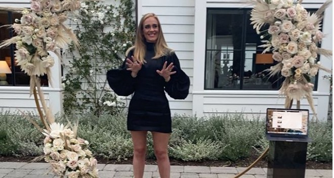 Στη φωτογραφία ευχαριστεί δημόσια το είδωλό της, την Μπιγιονσέ, για τις έντονες συγκινήσεις που της χάρισε με το νέο της τραγούδι, το «Black is King». Φορώντας μια μακρυμάνικη μπλούζα και ένα μαύρο κολάν, η Αντέλ χαμογελά στον φακό, δείχνοντας με το χέρι της το νέο βίντεο κλιπ της Queen B, που παίζει στην οθόνη από πάνω της.
