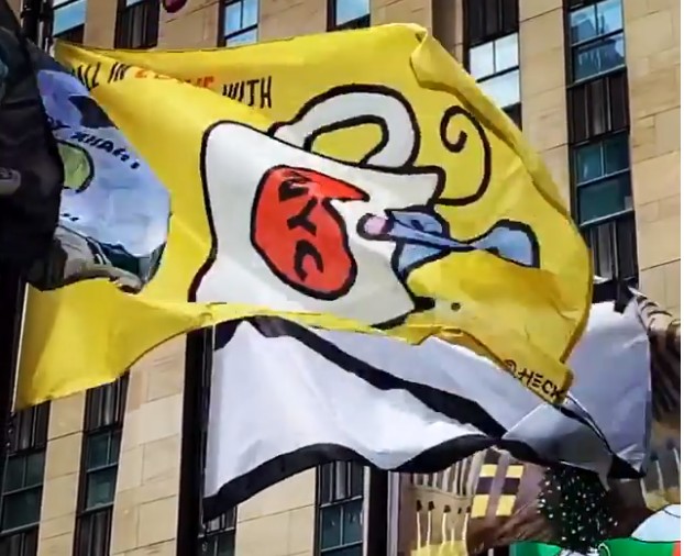 Στη δική του σημαία, ο Κουνς έγραψε με λαμπερά χρυσά μπαλόνια το ακρωνύμιο «NYC», σε ένα πολύχρωμο καρό φόντο.