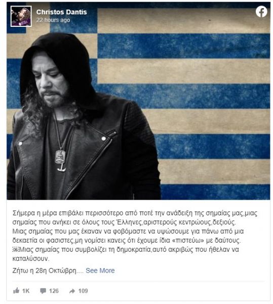 Το δικό του μήνυμα για την επέτειο της 28ης Οκτωβρίου έστειλε μέσω social media ο Χρήστος Δάντης, αφήνοντας μάλιστα αιχμές για τον έλληνα πρωθυπουργό, Κυριάκο Μητσοτάκη.