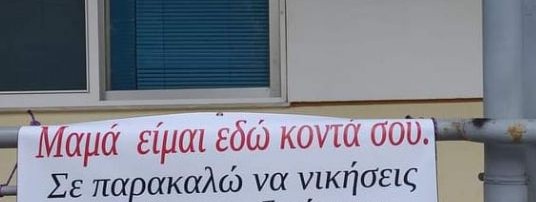 «Μαμά είμαι εδώ κοντά σου. Σε παρακαλώ να νικήσεις στη μάχη της ζωής σου. Γίνε γρήγορα καλά μανούλα μου. Σ’ αγαπώ πολύ» έγραφε το πανό.
