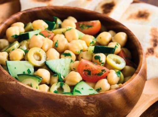 Ρίχνουμε τα ρεβίθια σε βαθύ μπολ σερβιρίσματος και προσθέτουμε όλα τα υλικά της σαλάτας.