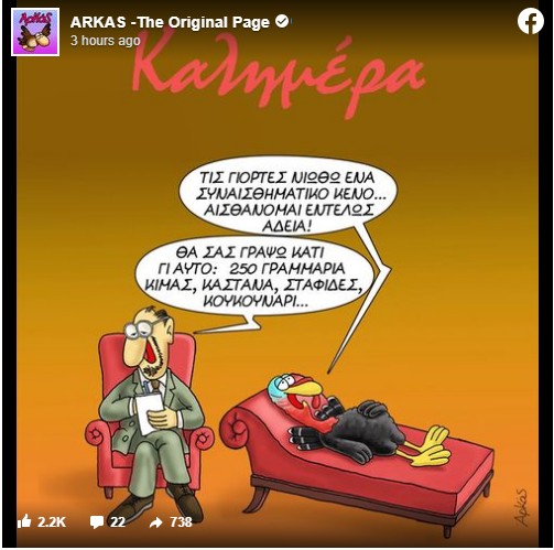 Απολαυστικός είναι για άλλη μια φορά, ο Αρκάς. Στην καθιερωμένη καλημέρα, που μας λέει με ανάρτησή του, στην σελίδα του στο facebook, επέλεξε να ασχοληθεί με τα… ψυχολογικά της γαλοπούλας.