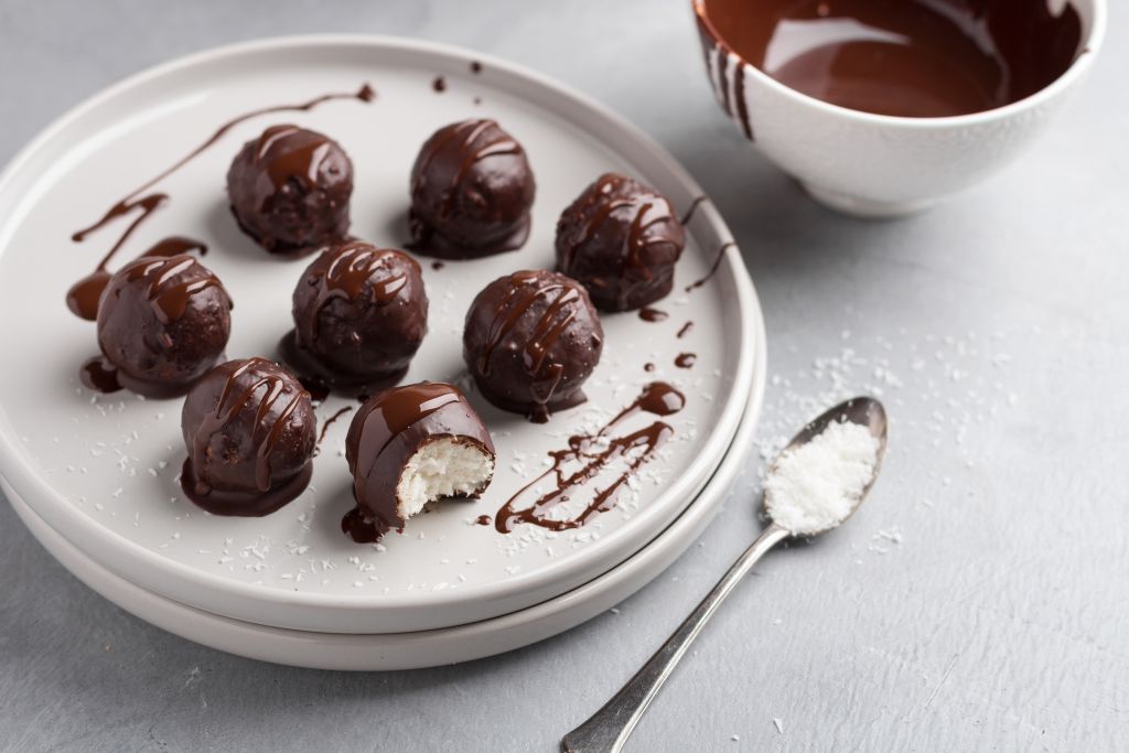 3. Λιώνετε την κουβερτούρα σε μπεν μαρί ή στον φούρνο μικροκυμάτων και βουτάτε μέσα τις μπάλες καρύδας.