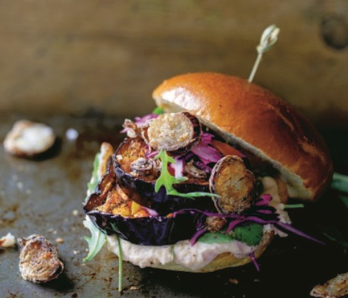 Αφού αφήσουμε λίγο τις μελιτζάνες να κρυώσουν, απλώνουμε από μία φέτα σε κάθε ψωμάκι και πασπαλίζουμε με ρόκα και κόκκινο λάχανο.