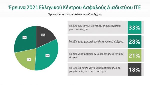 Εργαλεία γονικού ελέγχου σε μόνιμη βάση ή περιστασιακά χρησιμοποιεί το 48% των ερωτηθέντων ενώ ένα 18% δηλώνει ότι θα ήθελε αλλά δε γνωρίζει πως να τα χρησιμοποιεί.
