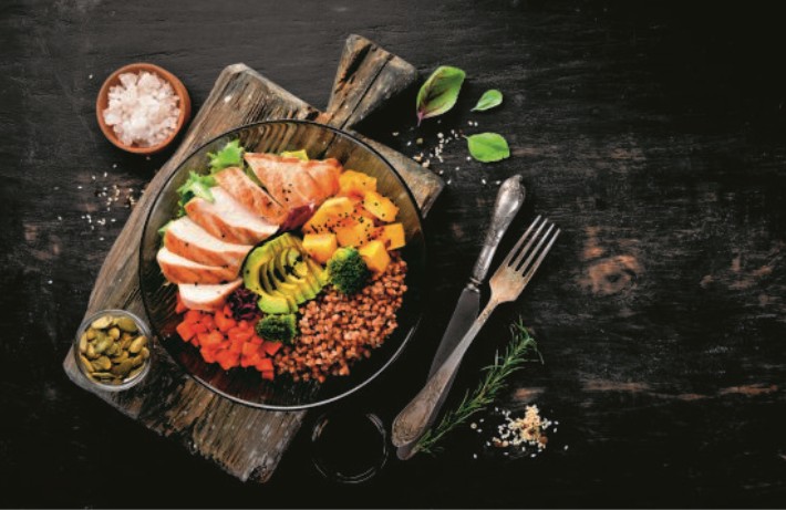 3. Σε μια πιατέλα στρώνετε τα φύλλα του μαρουλιού χοντροκομμένα με το χέρι και από πάνω βάζετε το αβοκάντο καθαρισμένο και κομμένο σε φέτες, τα κυβάκια κολοκύθας, το μπρόκολο, τα καρότα. Προσθέτετε το κριθάρι και το ψητό κοτόπουλο. Πασπαλίζετε με μαύρο σουσάμι και πασατέμπο.
