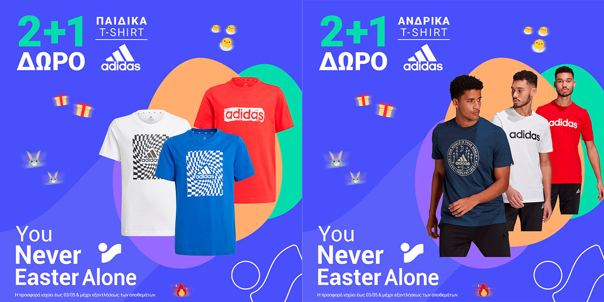 Κι όσο για την παράδοση που προστάζει ότι πρέπει να προσφέρουμε από ένα δώρο σε κάθε νεαρό μέλος της οικογένειας των κουμπάρων μας; Μπορεί κι εκείνη να ικανοποιηθεί πλήρως, αφού ειδικά για τις ημέρες του Πάσχα στα INTERSPORT μπορούμε να αγοράσουμε στιλάτα παιδικά, αλλά και ανδρικά T-shirt adidas μέσα από μια μοναδική προσφορά 2+1 Δώρο. Η προσφορά ισχύει μέχρι και τις 3 Μαΐου, τόσο για τα φυσικά καταστήματα όσο και για το e-shop, με τη διαφορά ότι στη δεύτερη περίπτωση θα πρέπει να χρησιμοποιήσουμε τα εκπτωτικά κουπόνια “easterkids” για τα παιδικά adidas T-shirts και “easter” για τα ανδρικά.