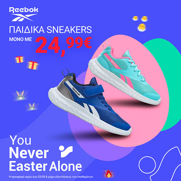 Για παράδειγμα, αν διαλέξετε για τις αγορές σας τα INTERSPORT, εκτός των μεγάλων εκπτώσεων που θα συναντήσετε οποιαδήποτε μέρα του χρόνου, θα βρείτε και μοναδικές πασχαλινές προσφορές. Έτσι, μπορείτε να προσφέρετε στο βαφτιστήρι σας τα πιο cool παιδικά Reebok sneakers έναντι μόλις €24,99 τόσο στα καταστήματα όσο και στο e-shop της INTERSPORT.