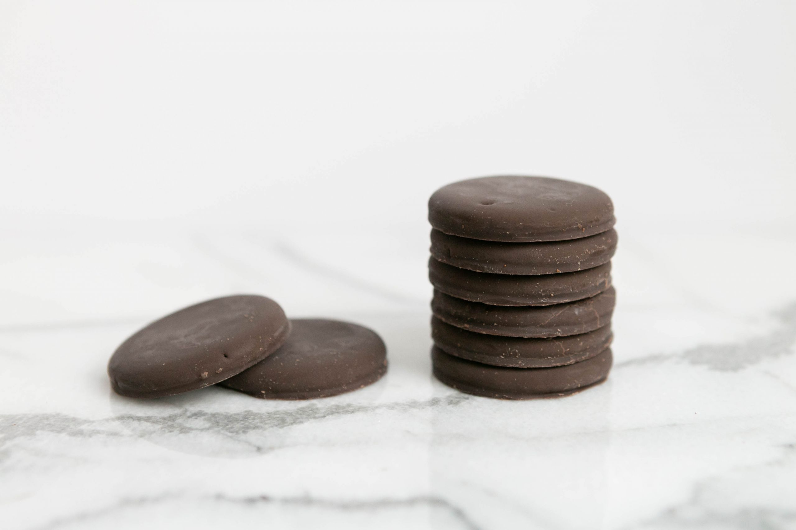 Βγάζουμε από την κατάψυξη το ρολό μας το ξετυλίγουμε και αφού κόψουμε καριόκες στο πάχος που επιθυμούμε, τις βουτάμε μια μια μέσα στην σοκολάτα. Με την βοήθεια ενός πιρουνιού τις αφαιρούμε και τις ακουμπάμε σε αντικολλητικό χαρτί. Αφήνουμε μέχρι να παγώσει καλά η επικάλυψη σοκολάτας.