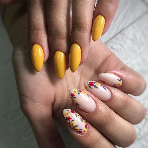 Κίτρινα και μπεζ νύχια με λουλούδια