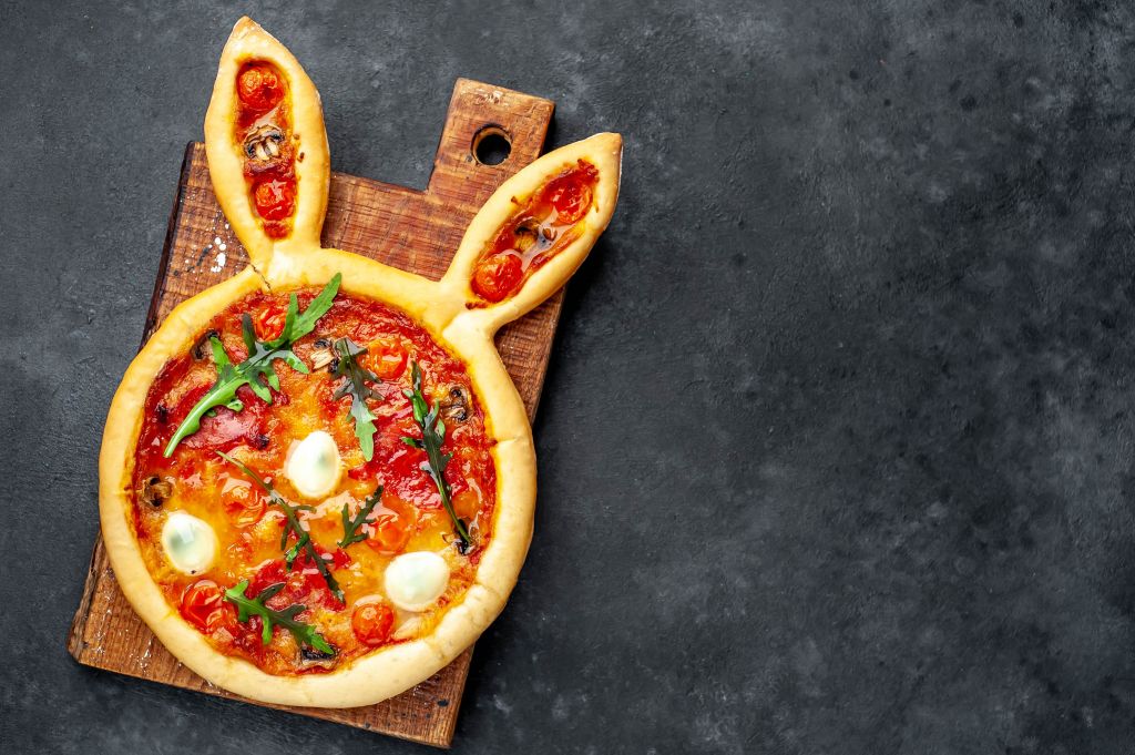 3. Ανοίγουμε με τη βοήθεια ενός πλάστη ένα μεγάλο φύλλο με τη ζύμη που έχουμε φτιάξει και το στρώνουμε σε ένα μεγάλο ταψί. Αφού φτιάξουμε το σχήμα της κλασικής πίτσας, σχηματίζουμε τα δύο αφτιά από το πασχαλινό κουνελάκι.