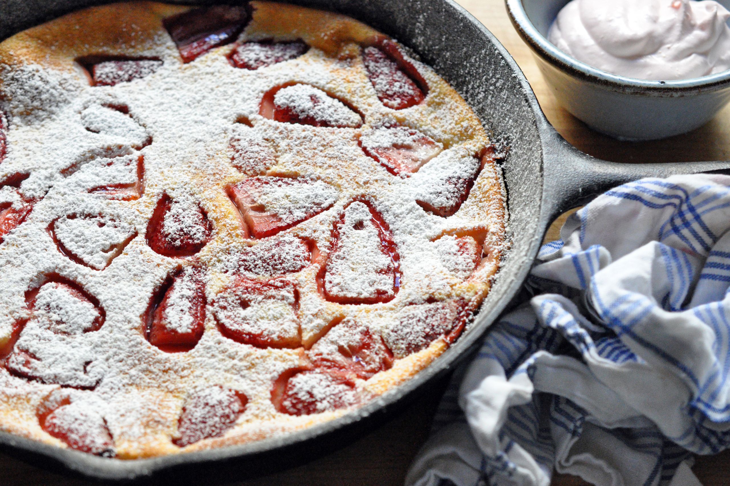 Μοιάζει περισσότερο με μεγάλη, παχιά κρέπα παρά με κέικ. Αυτό το- γαλλικής καταγωγής- γλυκό με φράουλες δεν έχει πολλή ζάχαρη και τρώγεται σκέτο αλλά ταιριάζει τέλεια και με μια μπάλα παγωτό βανίλια.