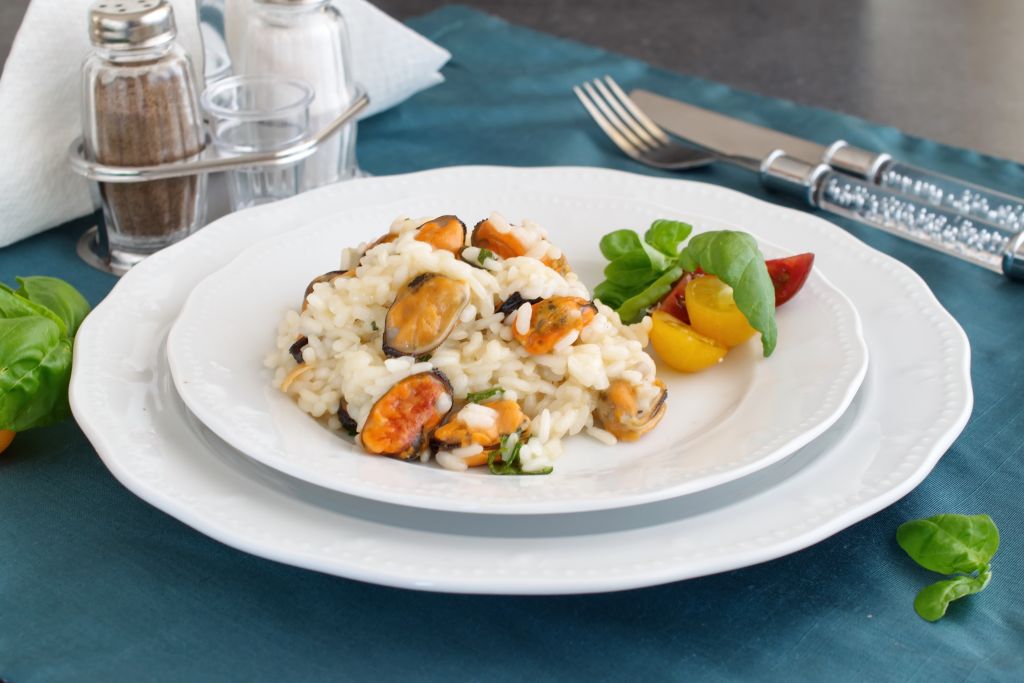 Οι σημερινές συνταγές είναι ριζότο με μύδια και πατάτες (Risotto patate e cozze) και σαλάτα ζυμαρικών με ντοματίνια και παρμεζάνα (Trecce alla Dorotea).