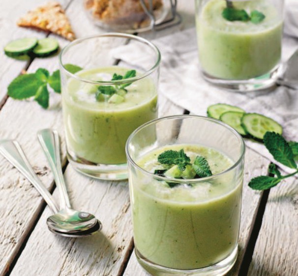 3. Τη βάζετε για λίγο στο ψυγείο και τη σερβίρετε κρύα με φρεσκοτριμμένο πιπέρι και ψιλοκομμένο αγγουράκι για γαρνιτούρα και λίγα φρέσκα φύλλα δυόσμου.