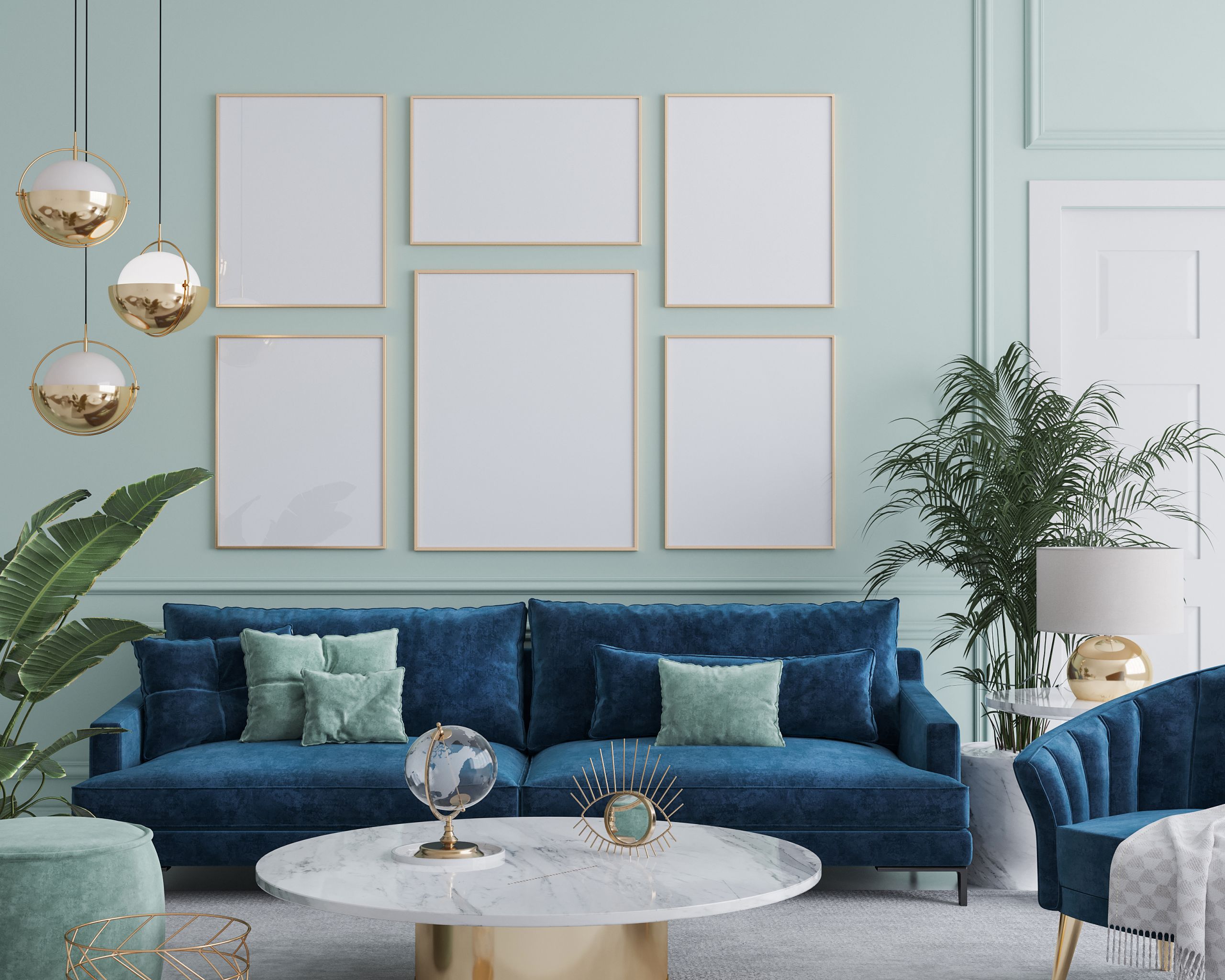 -Επιλέξτε έναν μπλε βελούδινο καναπέ για ένα εντυπωσιακό αποτέλεσμα στο σαλόνι σας.