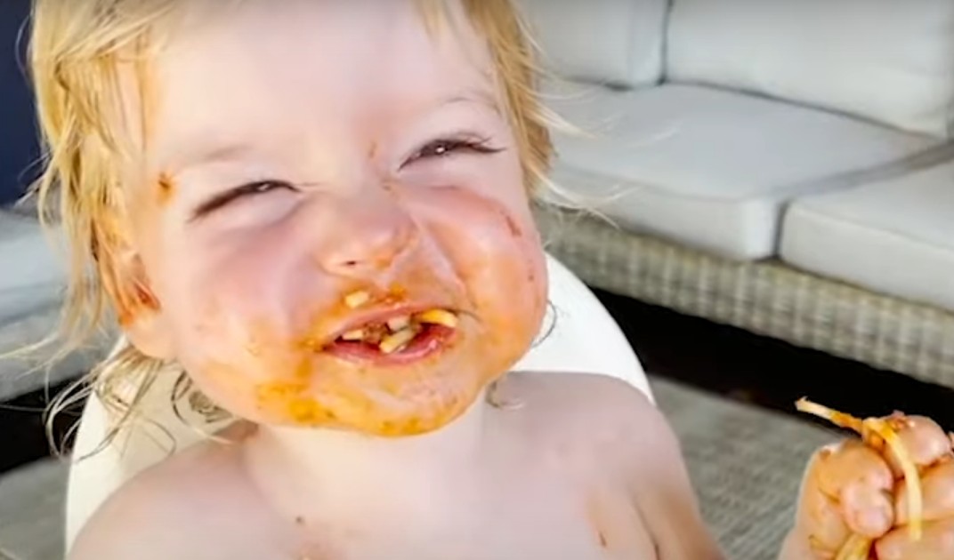 Ο μπόμπιρας γέμισε το στόμα του, τα μάγουλά του, τα χέρια του και το κορμί του με μακαρόνια και σάλτσα, αποδεικνύοντας πόσο πολύ απολαμβάνει το γεύμα του. Το βίντεο απαθανάτισε με το κινητό της η μαμά του, Κέιτι, η οποία σχολίασε ότι ήθελε ο γιος της να διδαχθεί με αυτόν τον τρόπο την ανεξαρτησία την ώρα του φαγητού.