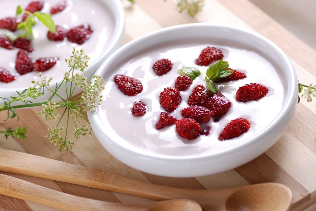 1. Χτυπάτε την κρέμα γάλακτος σε σφιχτή σαντιγί. Ρίχνετε στο γιαούρτι, την άχνη ζάχαρη και το εκχύλισμα βανίλιας και ανακατεύετε.