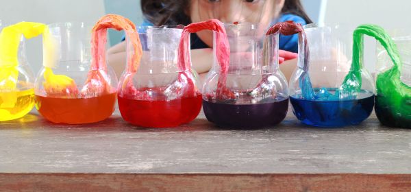 - Βάζετε την μία άκρη της πρώτης χαρτοπετσέτα μέσα στο πρώτο ποτήρι και την άλλη στο δεύτερο. Τη μία άκρη της δεύτερης χαρτοπετσέτας στο δεύτερο ποτήρι και την άλλη στο τρίτο κ.ο.κ. Τι βλέπετε;