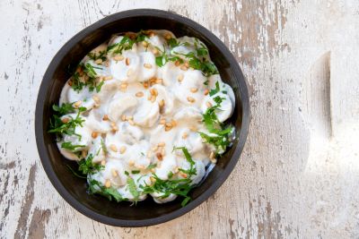 3.Σε μια κατσαρόλα νερό βράστε τα τορτελίνια, σύμφωνα με τις οδηγίες που αναγράφονται στην συσκευασία. Αφού βράσουν, τα σουρώνετε και τα βάζετε στην ζεστή κατσαρόλα πάνω στην φωτιά. Μέσα στην κατσαρόλα με τα τορτελίνια, βάλτε και το μείγμα γιαουρτιού.