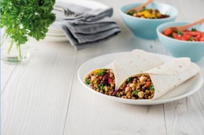 3. Στη συνέχεια, ζεσταίνετε τις τορτίγιες σε ένα αντικολλητικό τηγάνι και μόλις πάρουν ελάχιστο χρώμα και σχηματίσουν φουσκάλες, τις γεμίζετε με τη γέμιση από τα όσπρια και τις τυλίγετε. Μπορείτε αν θέλετε αντί για τορτίγιες να χρησιμοποιήσετε αραβικές πίτες.