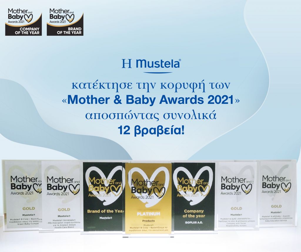 Την Τρίτη 28 Σεπτεμβρίου 2021, η Mustela® πρωταγωνίστησε στα «Mother & Baby Awards 2021», αποσπώντας συνολικά 12 βραβεία, με σημαντικότερα το «Brand of the Year» για τη Mustela® αλλά και το «Company of the year» για την ISOPLUS, αποδεικνύοντας για μία ακόμη φορά τον πρωταγωνιστικό ρόλο της Mustela® στον κλάδο των προϊόντων φροντίδας του μωρού, του παιδιού αλλά και της μέλλουσας και νέας μαμάς.