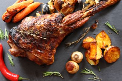 Πλύνετε καλά το αρνί σας και τοποθετήστε το σε ένα ταψί που θα έχετε καλύψει με λαδόκολλα. Καρυκεύστε με το αλάτι, το τριμμένο πιπέρι και την πάπρικα, κάνοντας μασάζ στο κρέας και από τις δύο πλευρές. Χαράξτε το αρνάκι σε διάφορα σημεία και σφηνώστε τη μία σκελίδα σκόρδου αφού την κόψετε σε κομματάκια και τους κόκκους πιπεριού. Καθαρίστε και κόψτε τις πατάτες σε μεγάλα κομμάτια (περίπου στα έξι ή στα οκτώ) μέσα σε ένα μπολ. Ψιλοκόψτε την άλλη σκελίδα σκόρδου και προσθέστε την στις πατάτες μαζί με τα μπαχαρικά, το ελαιόλαδο και τη μουστάρδα. Ανακατέψτε καλά και απλώστε τις πατάτες στο ταψί γύρω από το αρνί. Αλείψτε το με το λάδι που θα έχει μείνει στο μπολ. Σκεπάστε το ταψί με αλουμινόχαρτο και ψήστε το για 1,5 ώρα σε φούρνο που θα έχετε προθερμάνει στους 200 βαθμούς. Έπειτα αφαιρέστε το αλουμινόχαρτο και ψήστε το για άλλα τριάντα λεπτά περίπου.