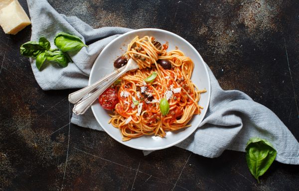 Πλύνετε, ξεφλουδίστε και ψιλοκόψτε τις ντομάτες. Σε μία κατσαρόλα ζεστάνετε ελαιόλαδο και σοτάρετε το κρεμμύδι και το σκόρδο για 2 με 3 λεπτά. Προσθέστε τις ψιλοκομμένες ντομάτες ,το αλάτι, το πιπέρι, τα φύλλα βασιλικού και την ζάχαρη κι αφήστε τα να βράσουν για 15-20 λεπτά. Σε άλλη κατσαρόλα βράστε τα μακαρόνια και σουρώστε τα. Βάλτε τα σε πιάτα, περιχύστε με την σάλτσα και πασπαλίστε με τη γραβιέρα.