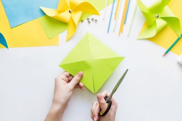 Κολλήστε την μία γωνία στο κέντρο και αφήστε την επόμενη «ελεύθερη» ώστε να δημιουργηθεί ο ανεμόμυλος.