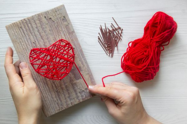 Πάρτε το κόκκινο νήμα και δέστε την μία άκρη καλά στο ένα καρφάκι. Μετά ακανόνιστα περάστε το νήμα στα καρφάκια έτσι ώστε να σχηματιστεί η καρδιά. Όταν τελειώσετε δέστε την άλλη άκρη, καλά, σε ένα καρφάκι και κόψτε το νήμα που περισσεύει.