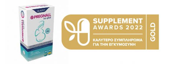 GOLD AWARD για το PREGNALL BIO-PLUS στην κατηγορία «Καλύτερο συμπλήρωμα για την εγκυμοσύνη». Συνδυάζοντας, μεταξύ άλλων, το φολικό οξύ με τη χολίνη και το DHA, το PREGNALL BIO-PLUS προσφέρει τριπλή υποστήριξη, για την ομαλή ανάπτυξη του νευρικού συστήματος του εμβρύου και την υγεία της εγκύου.