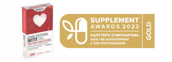 GOLD AWARD για το CHOLESTEROL BIOTIX στην κατηγορία «Καλύτερο συμπλήρωμα κατά της χοληστερίνης και των τριγλυκεριδίων». Όντας το μοναδικό στην ελληνική αγορά που συνδυάζει φυτικές στερόλες με εκχύλισμα Red Yeast Rice (κόκκινη μαγιά ρυζιού) και προβιοτικά, βοηθά πολύπλευρα στη μείωση της χοληστερίνης.