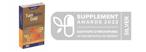 SILVER AWARD για το TUMBIOTIX GOLD στην κατηγορία «Kαλύτερο συμπλήρωμα για τη λειτουργία του εντέρου». Καινοτομεί γιατί αποτελεί το μοναδικό συμπλήρωμα διατροφής που συνδυάζει το Casperome, μία κλινικά μελετημένη φόρμουλα boswellia serrata, με προβιοτικά, συμβάλλοντας στην καλή λειτουργία του εντέρου.