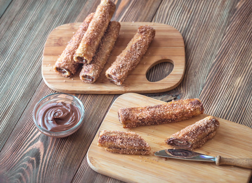 Κρατήστε μόνο την ψίχα από το ψωμί και πατήστε τη με ένα πλάστη. Βάλτε μια κουταλιά πραλίνα στο κέντρο της κάθε φέτας και ό,τι φρούτα θέλετε, π.χ. κομμάτια μπανάνας και φράουλας. Σχηματίστε τη φέτα σε ρολάκι. Σε ένα μπολ χτυπήστε το αυγό με το γάλα και βουτήξτε τα ρολάκια. Στη συνέχεια τηγανίστε τα λίγο μέχρι να πάρουν χρώμα. Σε ένα άλλο μπολ ρίξτε τη ζάχαρη με τη κανέλα και αφού τα ανακατέψτε, βουτήξτε εκεί τα ρολάκια μετά το τηγάνισμα.