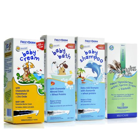 Με ένα σετ που περιλαμβάνει αφρόλουτρο, σαμπουάν, γαλάκτωμα και κρέμα θα τα έχετε όλα σε ένα. Το σετ βρεφικής Περιποίησης Frezyderm είναι κατάλληλό για το βρέφος σας. Στο σετ θα βρείτε αφρόλουτρο για το καθημερινό μπάνιο που σέβεται το pH, τη φυσιολογική δερματική χλωρίδα και τον δερματικό φραγμό του βρέφους, εμπλουτισμένο με εστέρες από αμύγδαλο.