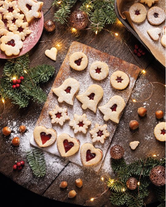 Απλώστε τη μαρμελάδα στα μισά μπισκότα και καλύψτε τα με τα υπόλοιπα, έτσι ώστε να δημιουργήσετε σαντουιτσάκια, που έχουν βάση τα ολόκληρα μπισκότα και κάλυμμα εκείνα με την τρύπα στη μέση, για να φαίνεται η μαρμελάδα από μέσα. Γαρνίρετε με ζάχαρη άχνη και σερβίρετε.